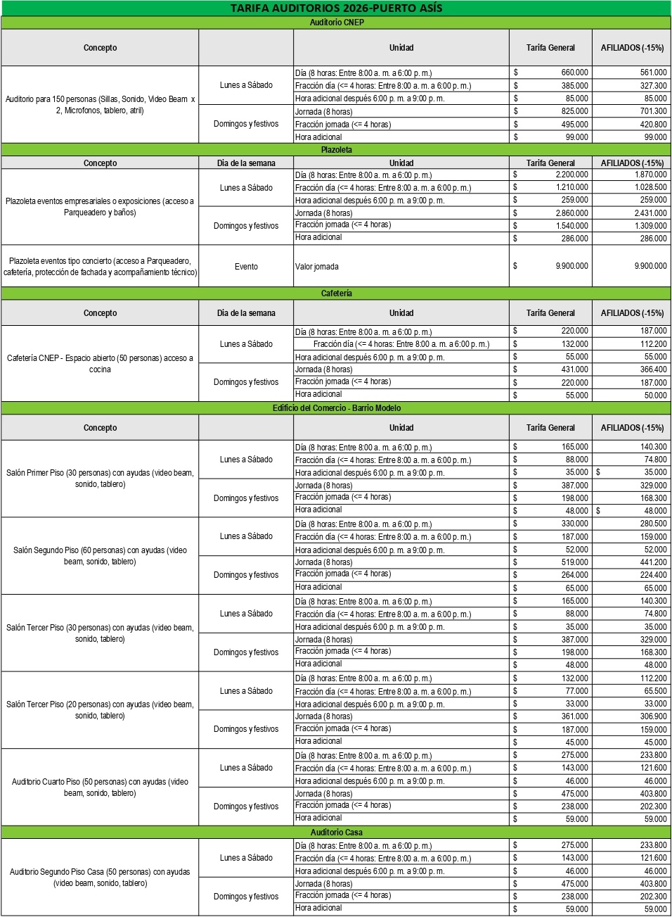 - Todo alquiler que requiera más de cuatro (4) horas incluidos los tiempos de decoración, montaje y desmontaje por parte del arrendatario deben cancelar la tarifa del DÍA completo.