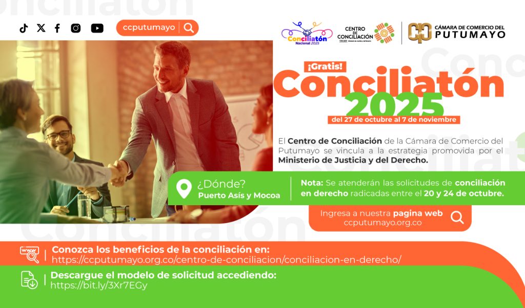 El Centro de Conciliación de la Cámara de Comercio participará del evento a través de la sede Puerto Asís y Mocoa, es decir, que las partes en principio (convocante y convocado) deberán tener domicilio o residencia en los municipios mencionados.