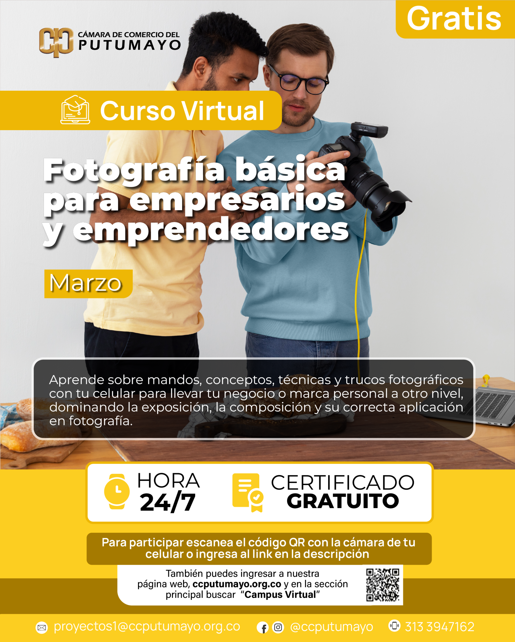Experto invitado: Armando Rojas Flórez. Este curso virtual estará habilitado del 2 al 30 de marzo del 2026. Lugar: Campus virtual. Objetivo: Aprende sobre mandos, conceptos, técnicas y trucos fotográficos con tu celular para llevar tu negocio o marca personal a otro nivel, dominando la exposición, la composición y su correcta aplicación en fotografía. La capacitación es gratuita. ¡Inscríbete ahora!