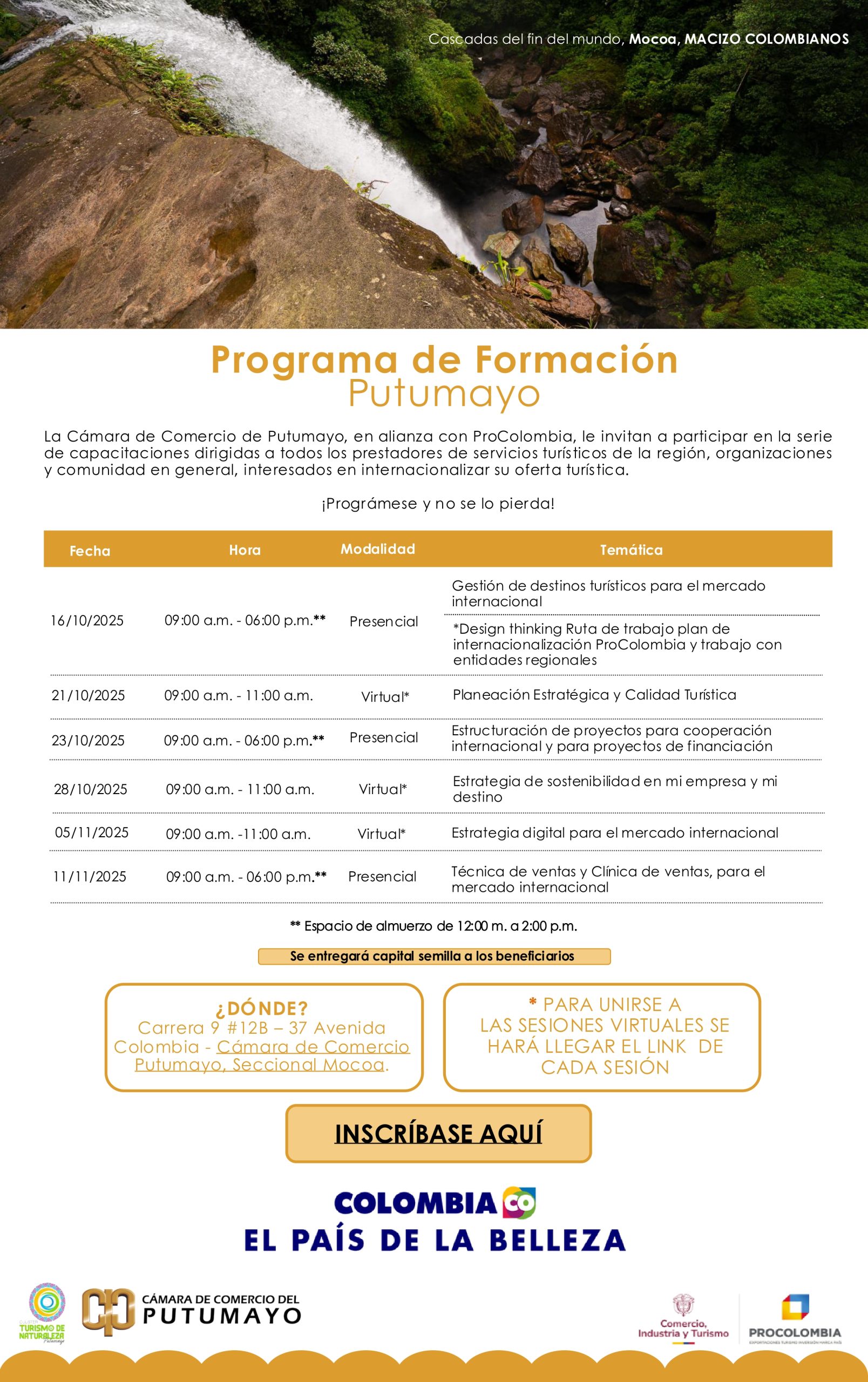 La Cámara de Comercio del Putumayo, en alianza con ProColombia, te invita a participar en las jornadas de formación diseñadas para fortalecer y proyectar tu oferta turística hacia mercados internacionales .